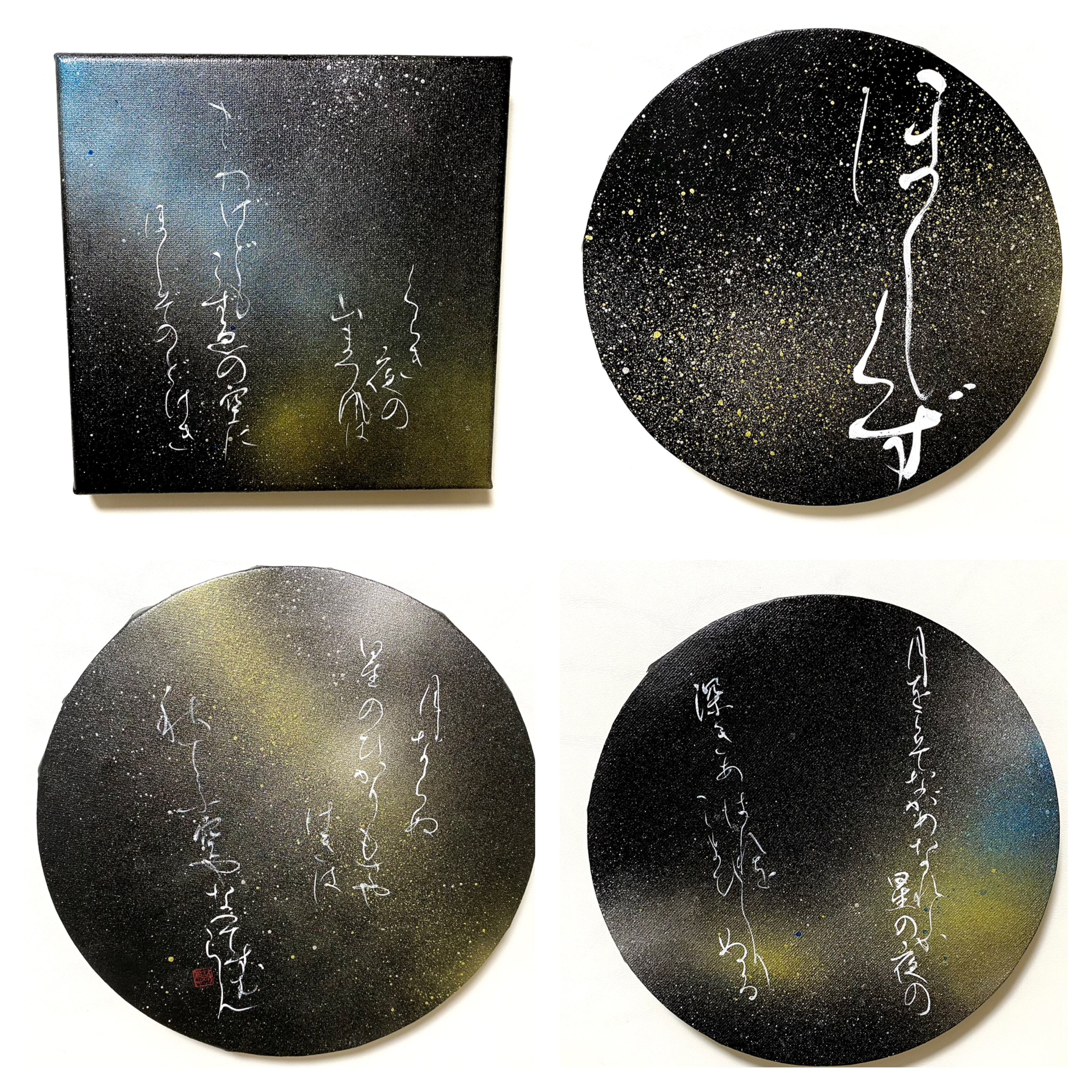 スプレーアートを施したキャンバスに和歌をしたためた。
